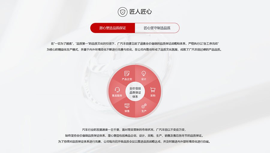 全球品質(zhì),打造“零不良”模范工廠:廣汽豐田秉承豐田數(shù)十年汽車制造之精義,引進了全球最先進的生產(chǎn)設(shè)備和工藝,布局了沖壓、焊裝、成型、涂裝和總裝等五大生產(chǎn)工藝,取得豐田全球品質(zhì)監(jiān)查雙線“零不良”,著力打造“豐田全球模范工廠”。
