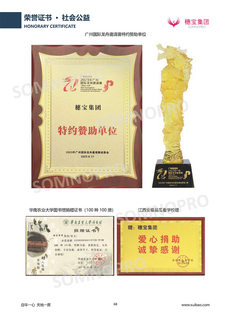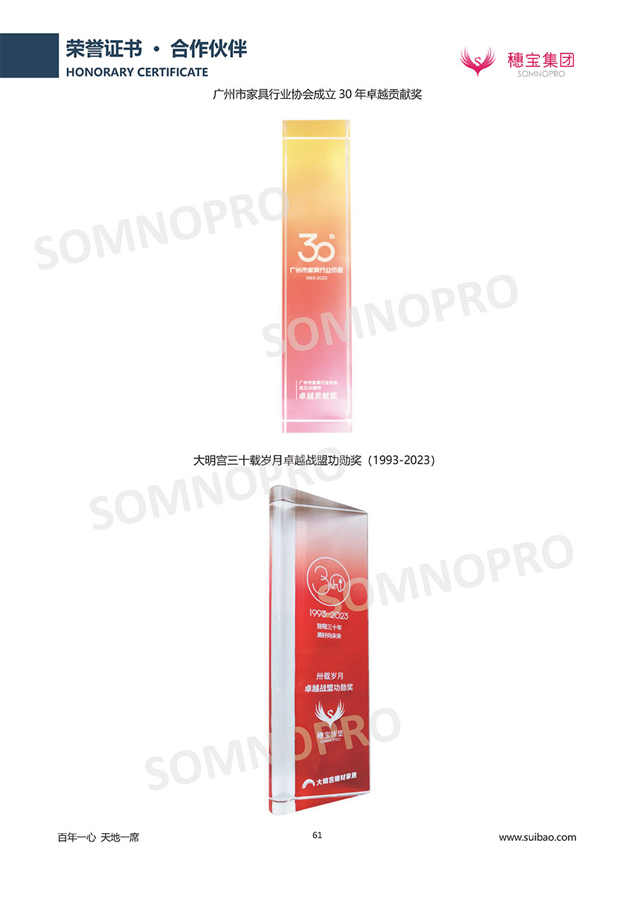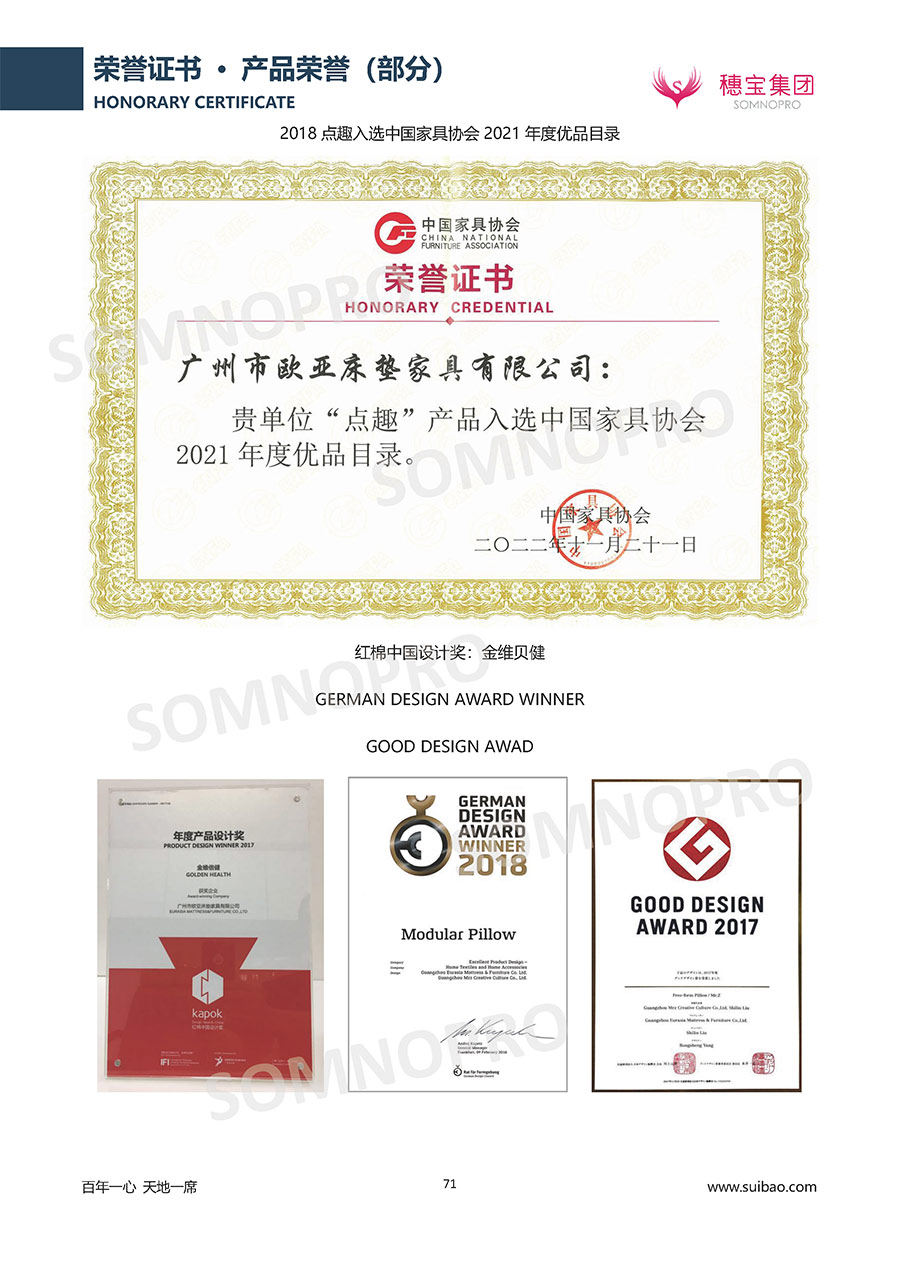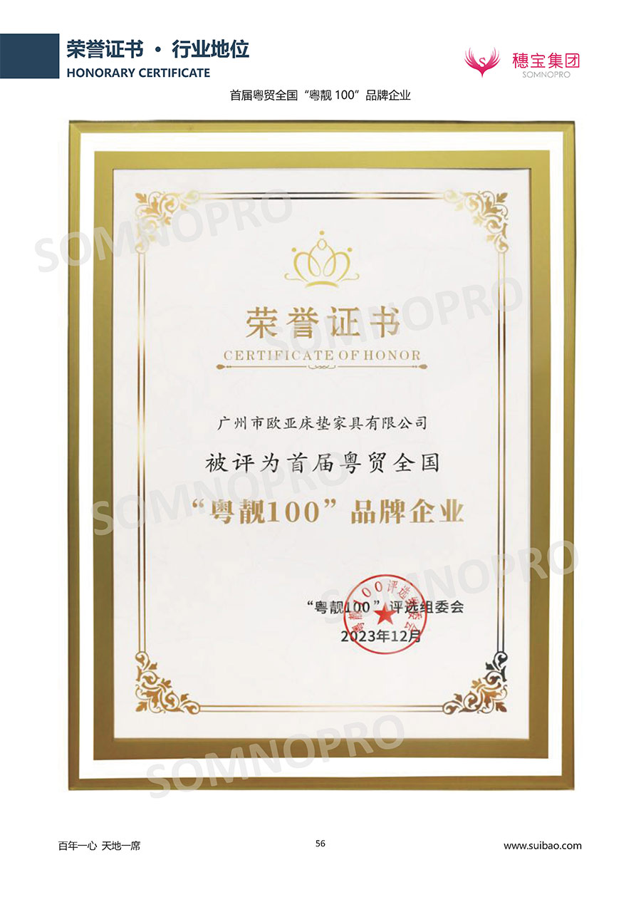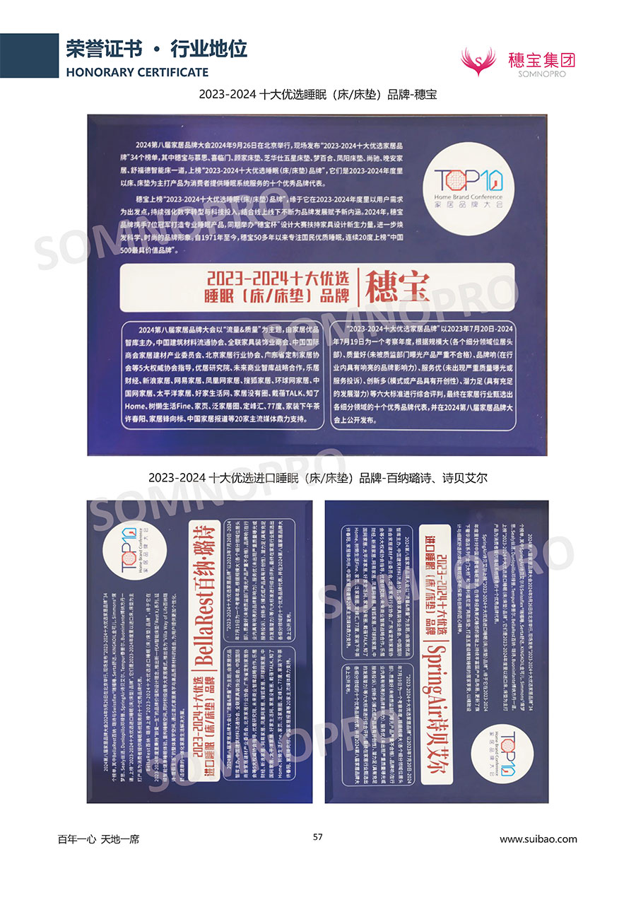 自1971年獨(dú)立研發(fā)生產(chǎn)出專屬國(guó)人的彈簧床墊,穗寶關(guān)于優(yōu)質(zhì)深度睡眠的研究已有半個(gè)世紀(jì)的歷史。穗寶一直專注床墊,專注中國(guó)消費(fèi)者的睡眠研究,針對(duì)中國(guó)人特點(diǎn)進(jìn)行優(yōu)化創(chuàng)新,不斷提升國(guó)人的睡眠體驗(yàn),只為成就每個(gè)晚上8小時(shí)的優(yōu)質(zhì)深度睡眠。憑借不斷革新的研發(fā)科技和深受消費(fèi)者信賴的產(chǎn)品品質(zhì),穗寶集團(tuán)旗下品牌和產(chǎn)品屢獲國(guó)內(nèi)外大獎(jiǎng),連續(xù)20年榮膺中國(guó)500最具價(jià)值品牌,品牌價(jià)值高達(dá)302.89億元。