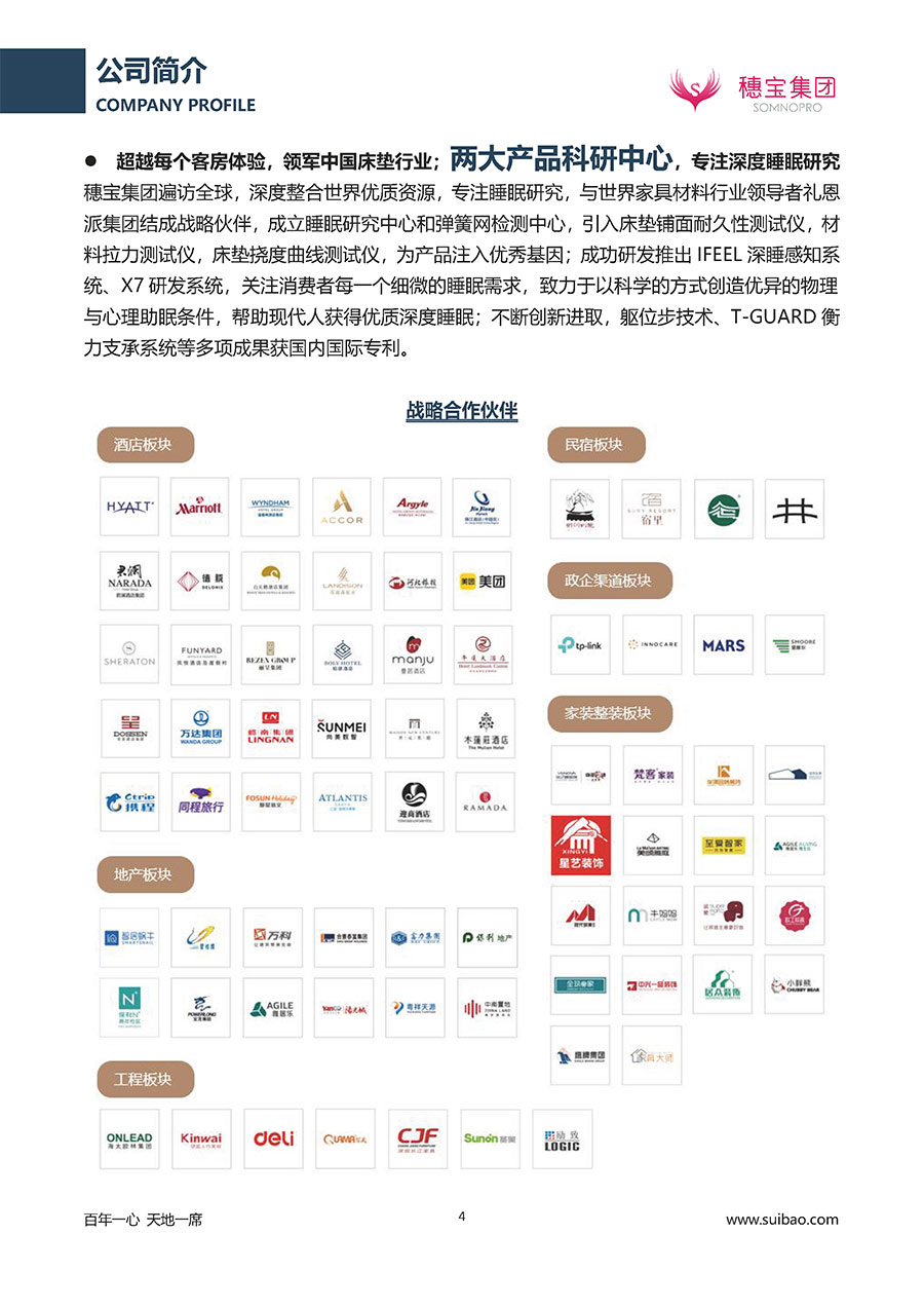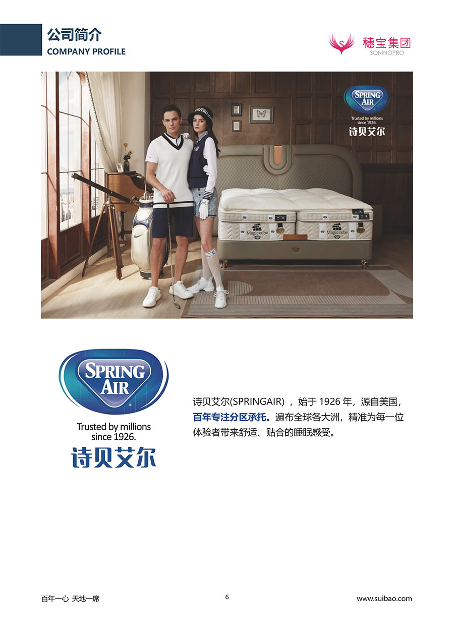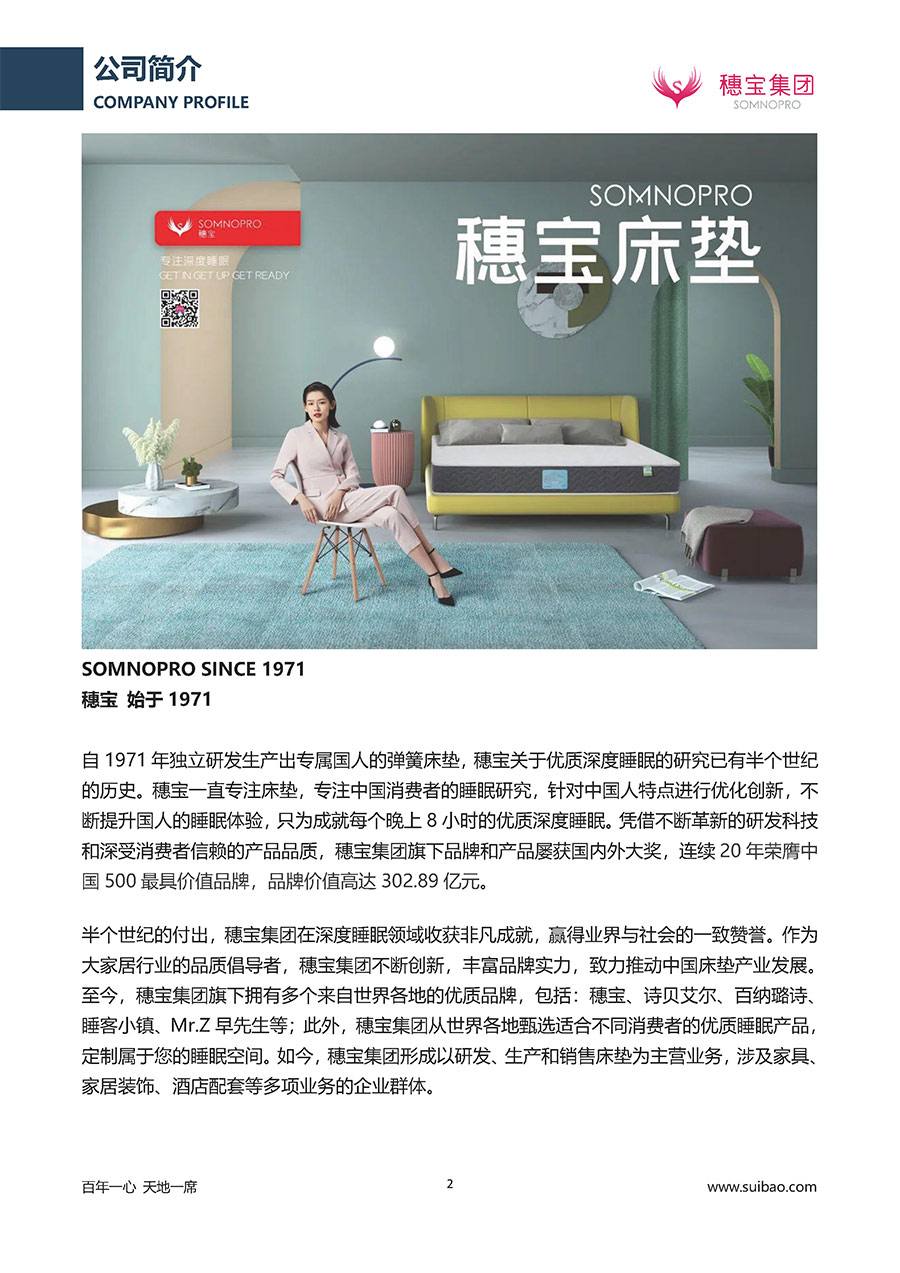 半個(gè)世紀(jì)的付出,穗寶集團(tuán)在深度睡眠領(lǐng)域收獲非凡成就,贏得業(yè)界與社會(huì)的一致贊譽(yù)。作為大家居行業(yè)的品質(zhì)倡導(dǎo)者,穗寶集團(tuán)不斷創(chuàng)新,豐富品牌實(shí)力,致力推動(dòng)中國(guó)床墊產(chǎn)業(yè)發(fā)展。至今,穗寶集團(tuán)旗下?lián)碛卸鄠€(gè)來(lái)自世界各地的優(yōu)質(zhì)品牌,包括:穗寶、詩(shī)貝艾爾、百納璐詩(shī)、睡客小鎮(zhèn)、Mr.Z早先生等;此外,穗寶集團(tuán)從世界各地甄選適合不同消費(fèi)者的優(yōu)質(zhì)睡眠產(chǎn)品,定制屬于您的睡眠空間。如今,穗寶集團(tuán)形成以研發(fā)、生產(chǎn)和銷售床墊為主營(yíng)業(yè)務(wù),涉及家具、家居裝飾、酒店配套等多項(xiàng)業(yè)務(wù)的企業(yè)群體。