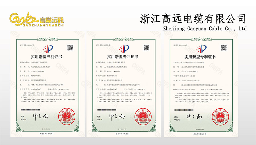 高遠電纜是浙江省電線電纜重點工業(yè)企業(yè),浙江省專精特新企業(yè)、浙江省科技型企業(yè),浙江省標準化良好行為AAA級企業(yè);獲得了國家頒發(fā)的生產(chǎn)許可證,通過了CCC國家強制性產(chǎn)品認證,ISO9001質(zhì)量體系認證,ISO14001環(huán)境體系認證,OHSAS18001職業(yè)健康安全管理體系認證,PCCC產(chǎn)品認證、B1級燃燒性能授權(quán)書;榮獲浙江省著名商標,浙江省重合同守信譽企業(yè),浙江省優(yōu)質(zhì)產(chǎn)品,市級研究開發(fā)中心,清潔工廠,綠色工廠等國家、省、市授權(quán)的榮譽稱號,取得了多項發(fā)明專利、實用型專利。