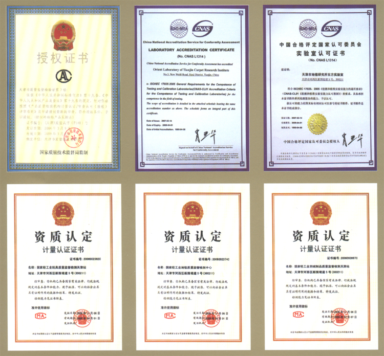 國家地毯質量監(jiān)督檢驗中心籌建于1987年,于1988年、1991年相繼通過了國家技術監(jiān)督局的計量認證考核和審查認可,是國家技術監(jiān)督局依法授權的國家級產品質量監(jiān)督檢驗機構。1999年、2003年和2006年又相繼通過了CNACL、CNAL和CNAS中國合格評定國家認可委員會和國家認證認可監(jiān)督管理委員會對實驗室資格“三合一”的復查認可和授權。