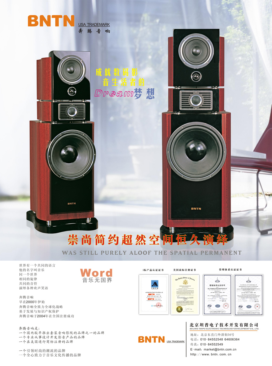 北京坦普電子技術(shù)開發(fā)有限公司是一家專業(yè)從事家庭影院設(shè)計(jì)、開發(fā)、銷售的公司,其主打品牌BNTN奔騰音響(中國中文注冊“萬馬奔騰”)是國內(nèi)較早推出套裝音響影院的品牌之一。