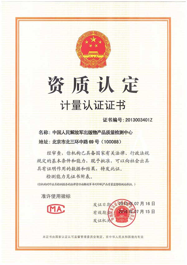 中國人民解放軍出版物產(chǎn)品質(zhì)量檢測中心(以下簡稱“檢測中心”)成立于2012年,2013年7月經(jīng)國家認(rèn)證認(rèn)可監(jiān)督委員會審核批準(zhǔn)授予中國計量認(rèn)證CMA認(rèn)可資質(zhì)。2014年9月通過國家認(rèn)證認(rèn)可監(jiān)督委員會計量認(rèn)證擴(kuò)項評審,批準(zhǔn)檢測能力三十余項。是全軍首家擁有國家級資質(zhì)的出版物產(chǎn)品質(zhì)量檢測鑒定機(jī)構(gòu),具有獨(dú)立為軍隊和社會提供公正、準(zhǔn)確的檢測數(shù)據(jù)及有法律效力的檢測報告的能力。